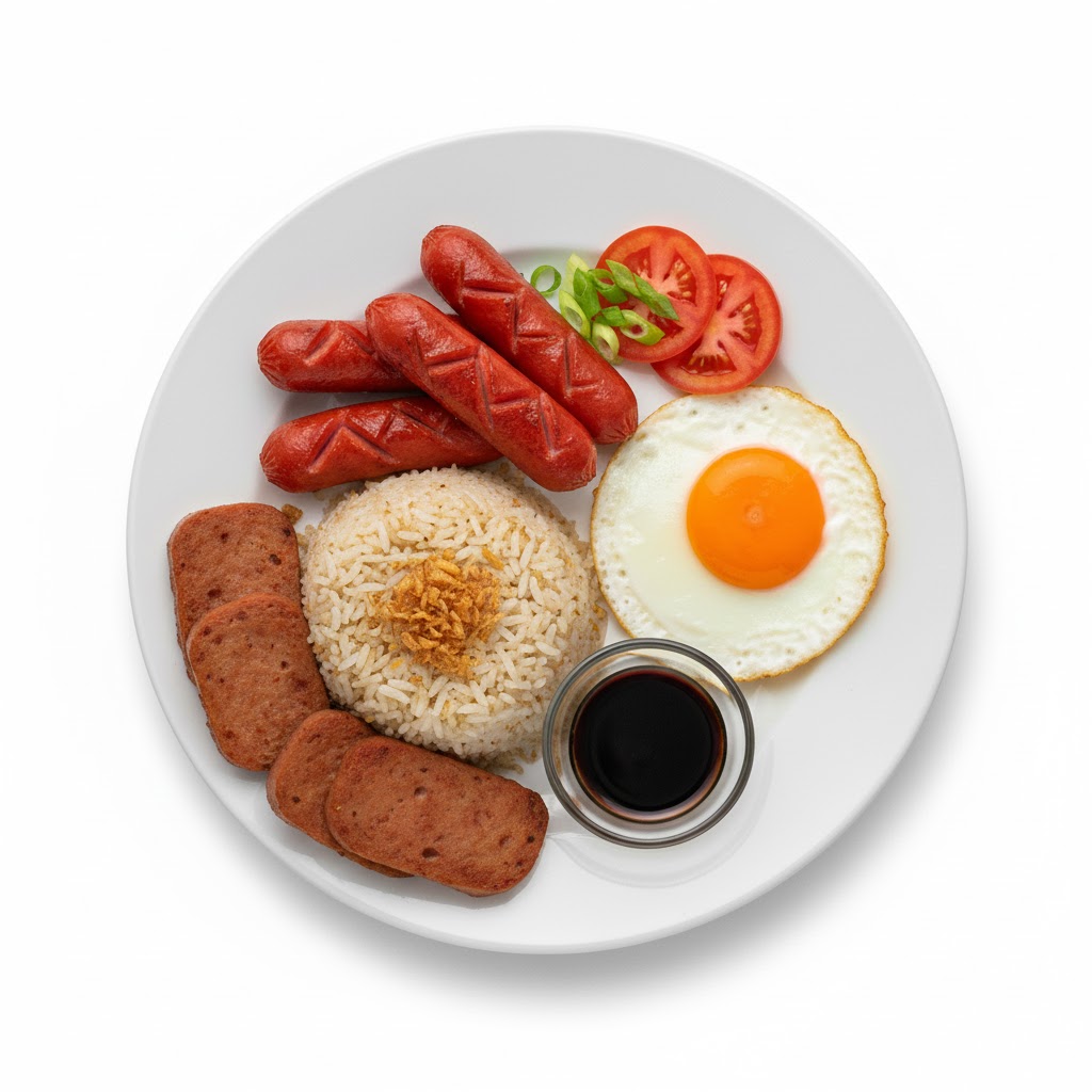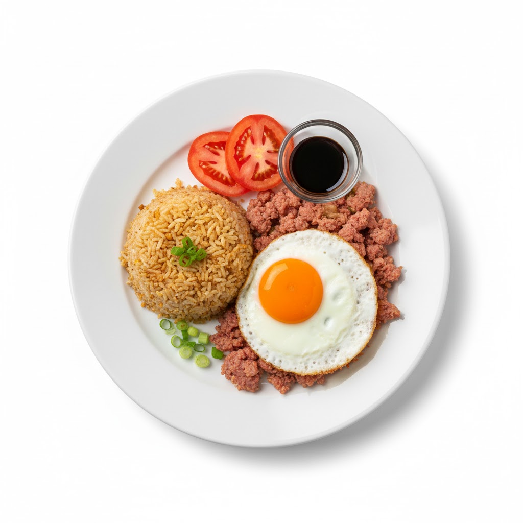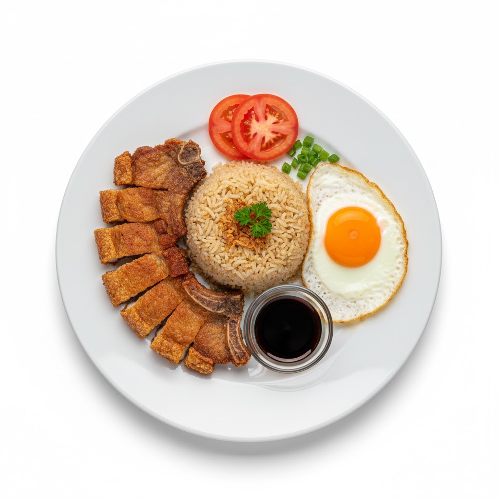 Juicy pork, fluffy fried egg, and garlic rice, all on one plate for a hearty breakfast that’s sure to satisfy your cravings.