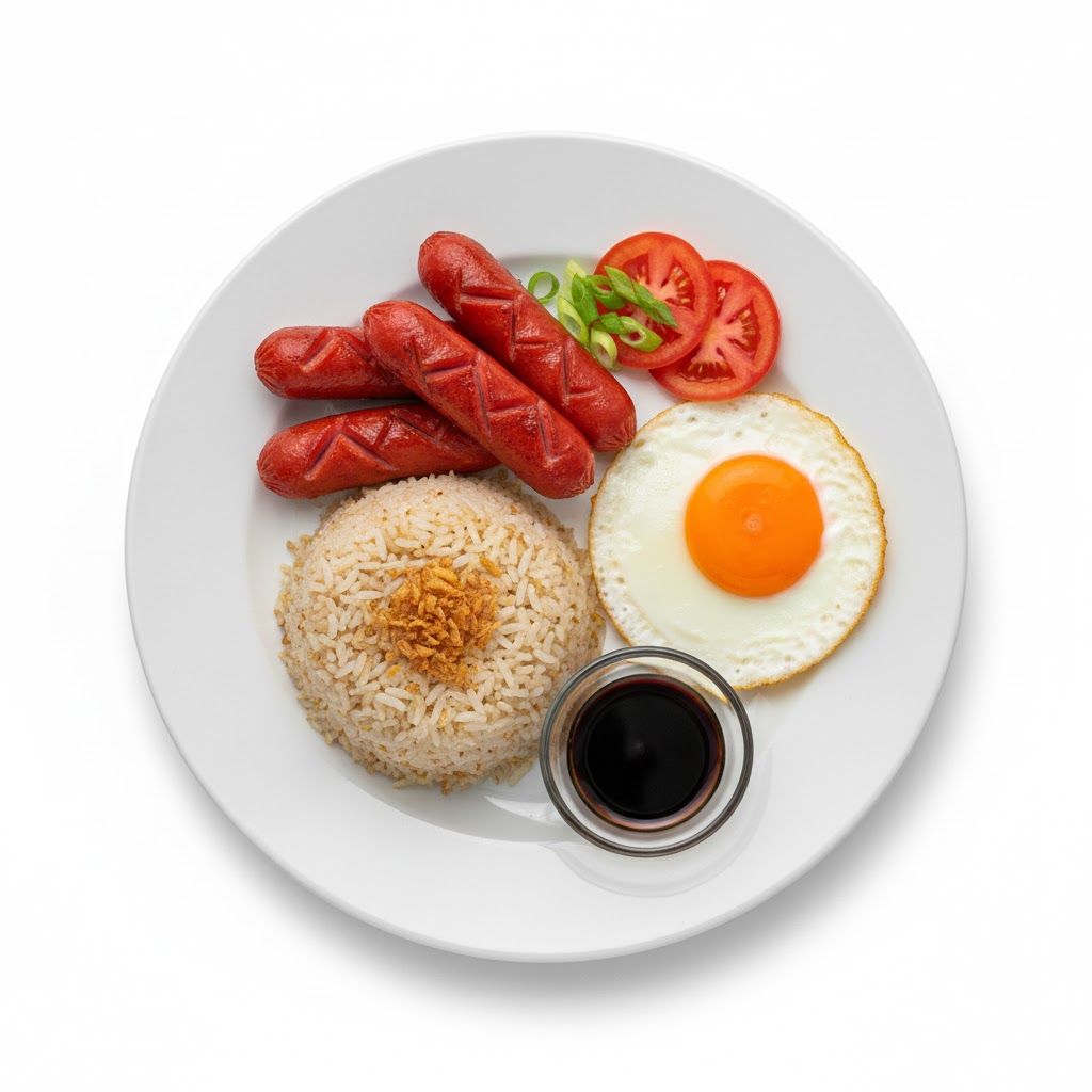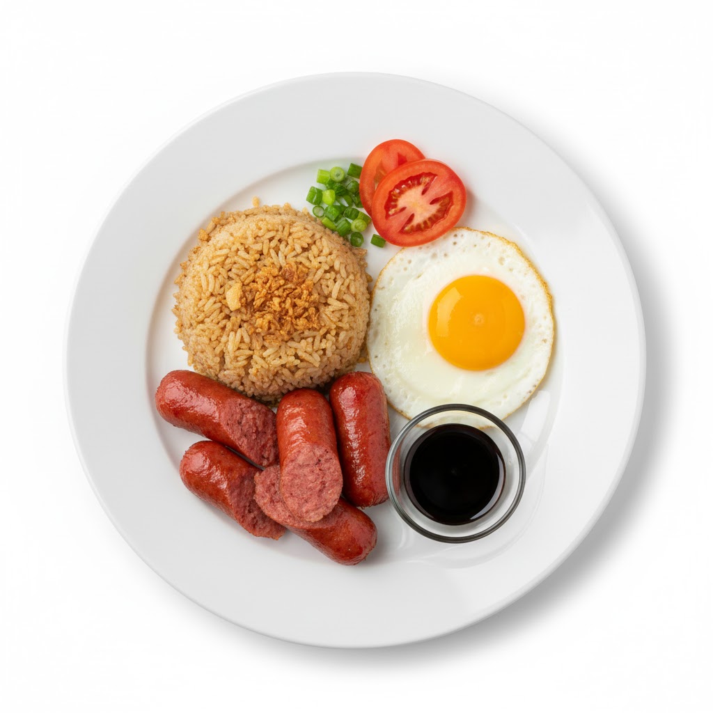 Smoky longganisa, fluffy fried egg, and garlic rice, all on one plate for a satisfying start to your day, packed with classic Filipino flavors.
