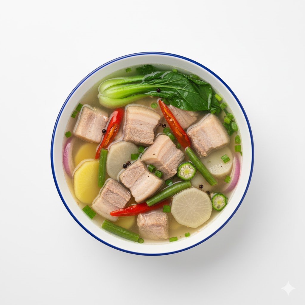 Indulge in Sinigang na Baboy! Tender pork in tangy tamarind broth with kangkong, radish, okra, sitaw. Perfect with hot rice, fish sauce, and extra chili.