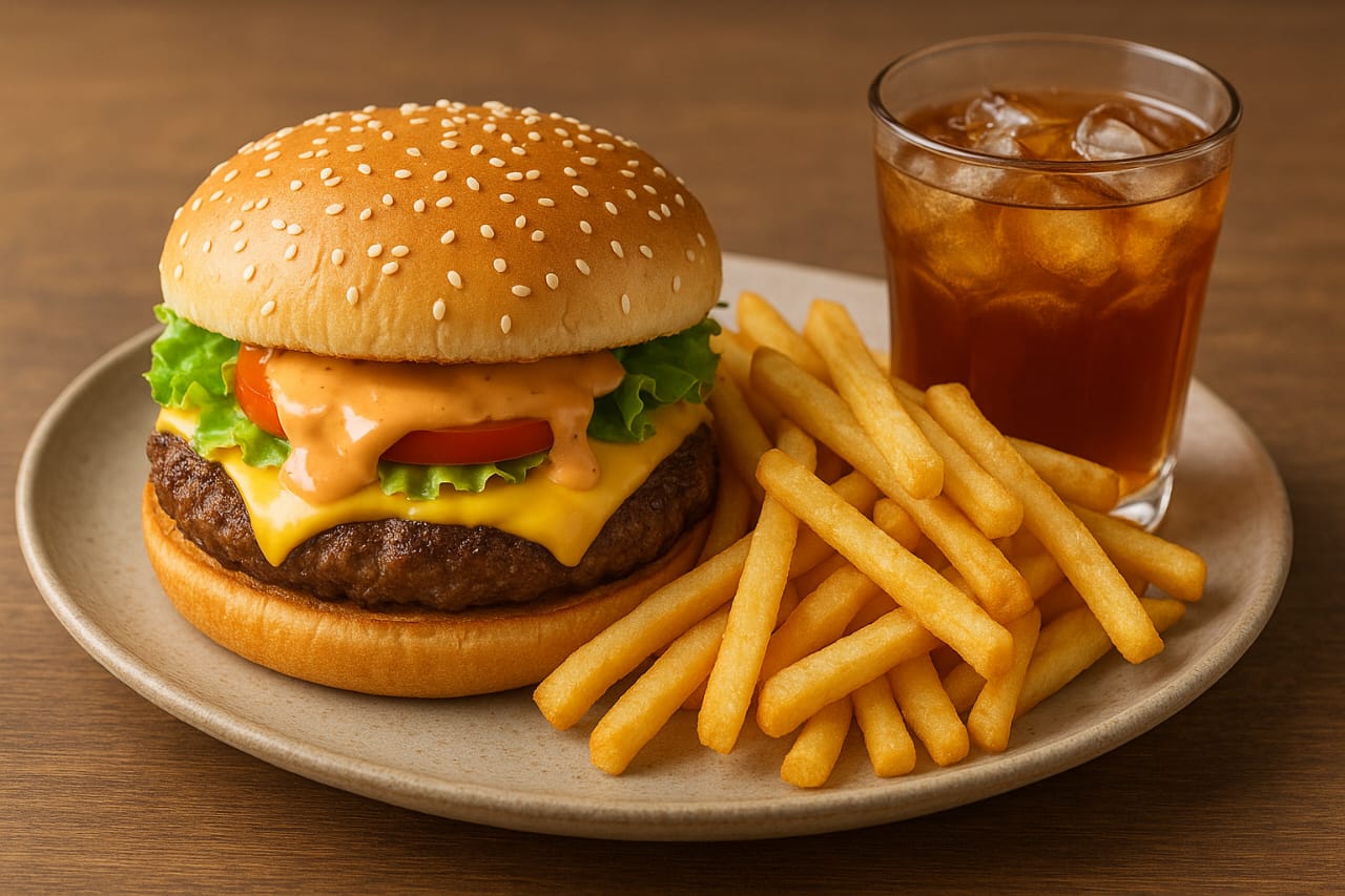 Indulge in our Classic Combo: juicy burger, crispy fries, and a chilled glass of house-made iced tea. The perfect, flavor escape.