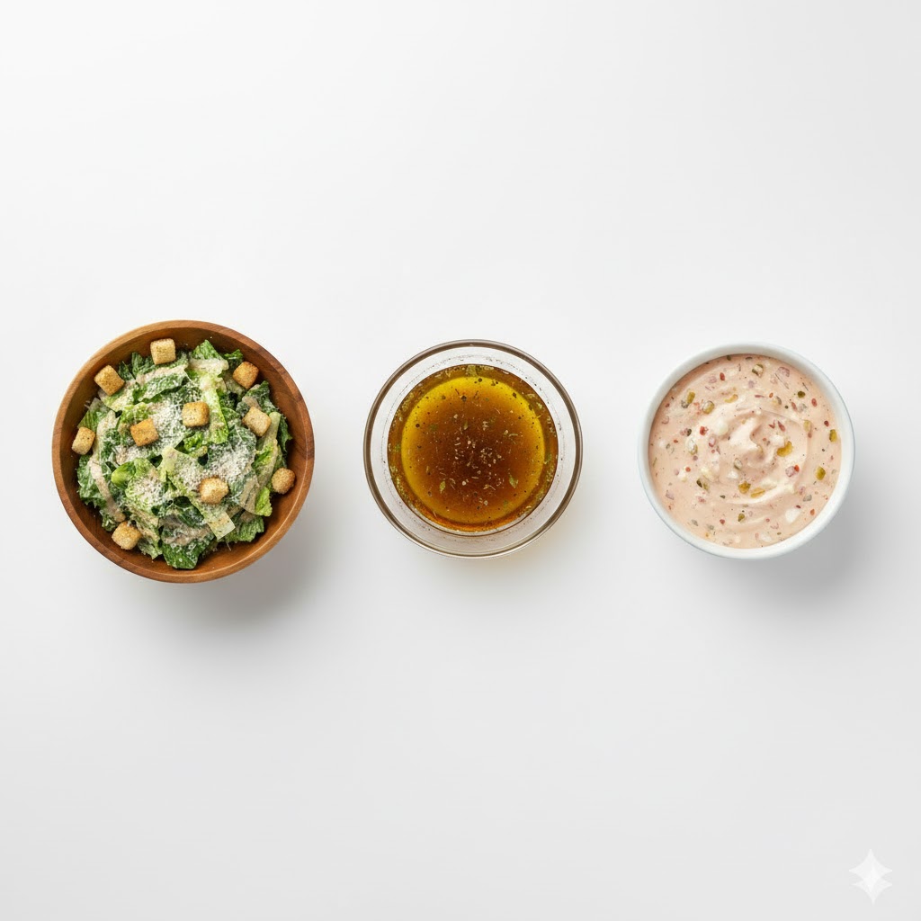 Indulge in our signature veggie trio: zesty Vinaigrette, classic Caesar, and creamy Thousand Island. Fresh, and perfectly balanced.